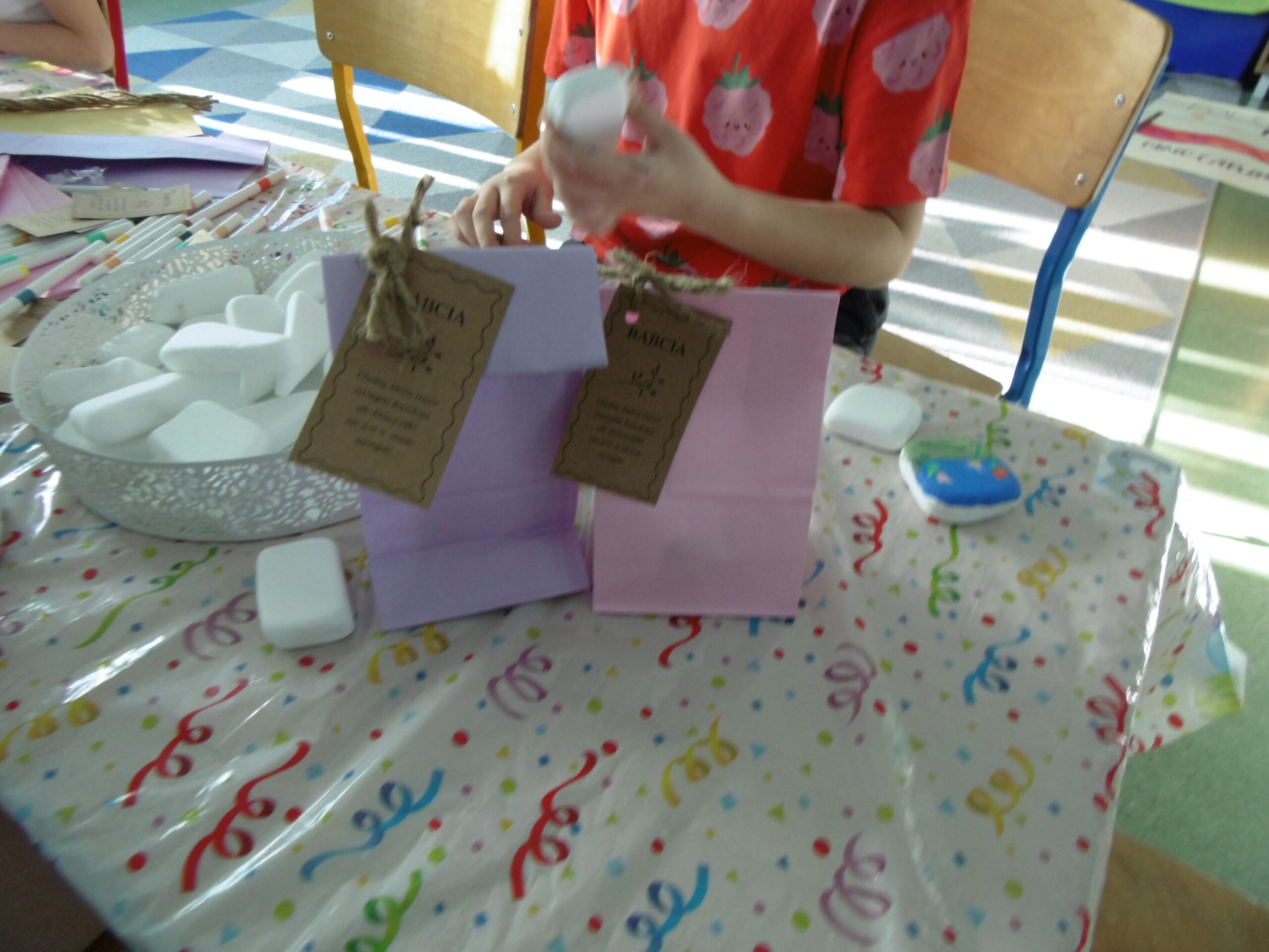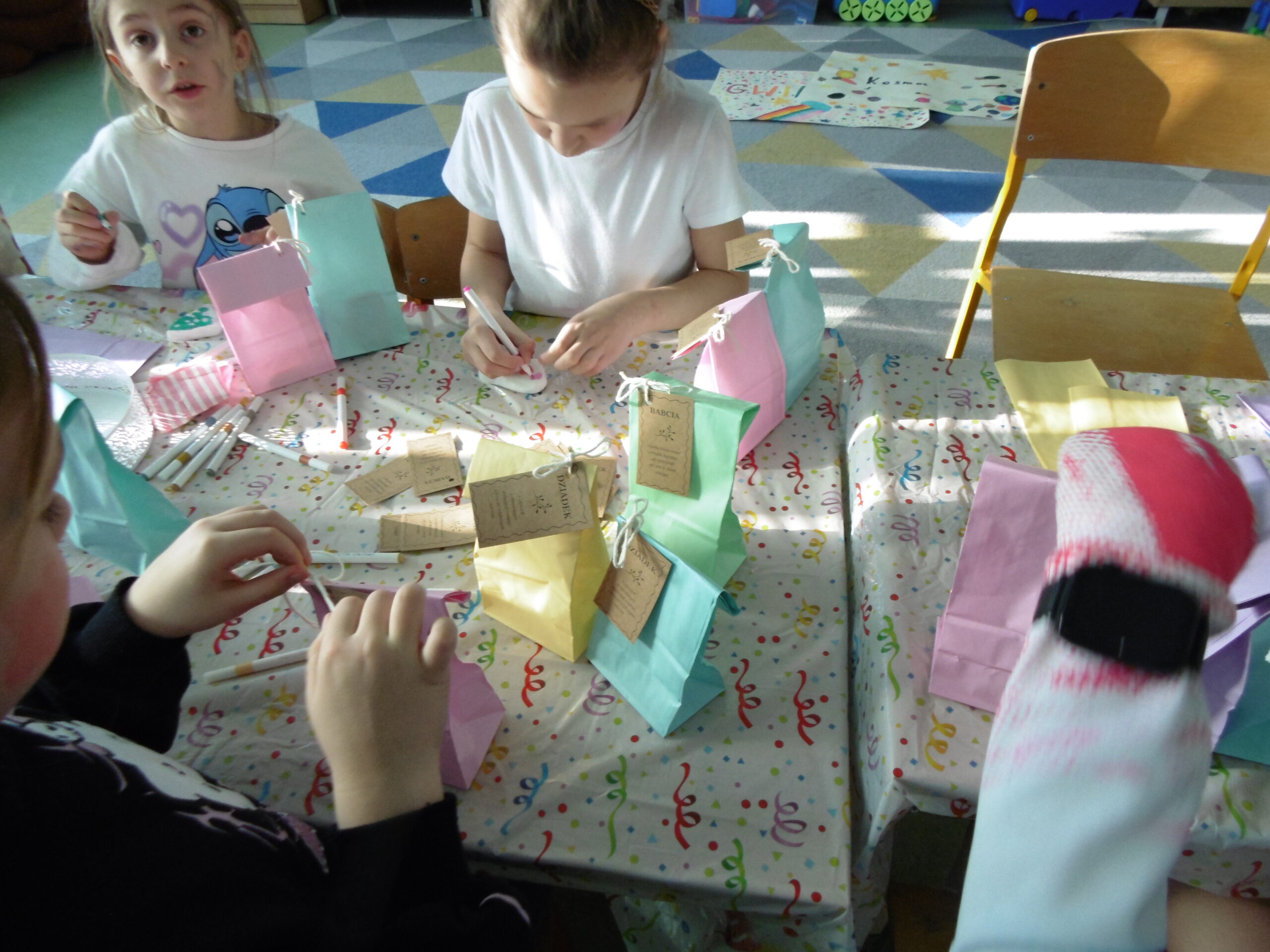 Dzieci tworzyły własnoręczne upominki – malowały kamienie, zamieniając je w kolorowe, pełne fantazji dekoracje. Każdy kamień został następnie zapakowany w barwną torebkę, aby stał się pięknym, osobistym prezentem dla ukochanych dziadków.